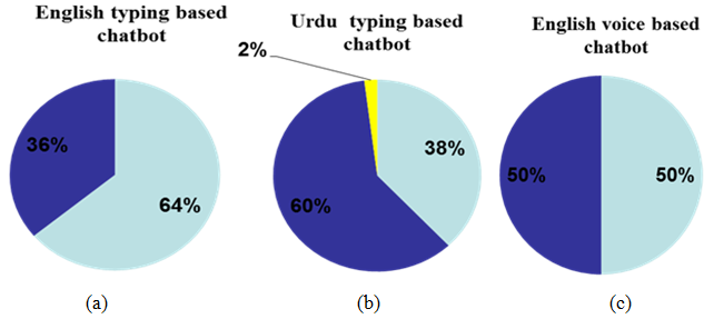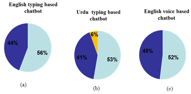 Figure 8 a, b, c is showing the combined comparative analysis of question 1, 2, 3. During testing of English typing based chatbot, out of 50 students, 52% of students replied with “strongly agree” with using this interface of chatbot and remaining 48% replied with “agree”. None of the student has found it difficult while using that English typing based chatbot. In testing Urdu typing based chatbot, 25 students among total of 50 students responded with “strongly agree” with using this Urdu typing based interface of chatbot, while the remaining 25 students replied with “agree”. None of the student has found it difficult while using that interface. In testing English voice based chatbot, among all students, 21 students (42%) responded “strongly agree” to use voice based chatbot and 26 students (58%) responded with “agree” to use this voice based chatbot. After comparative analysis of results, all interfaces were found easy to use and among three English typing based chatbot is found best.