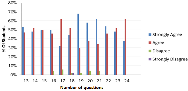Figure 12a, b, c is depicting the combined comparative analysis of question 13, 14, 15, 16, 17, 18, 19, 20, 21, 22, 23, 24. These questions are related to feasibility, effectiveness, efficiency, satisfaction and reusability of chatbot. It has been observed that comparatively a smaller number of students were disagreed with the questions related to chatbot usage at other places and questions related to the talking to a real examination centre employee.