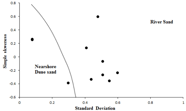 The relationship between granulometric parameters is significant for the construal of the transport and depositional environment of sediments as pointed out by several sources (e.g., [6]; [7]; [12]; [17]; [11]; [13]; [68]; [69]. The bivariate plot (fig. 5) shows the samples plotting in the river sand zone, indicating a fluvial environment. The bivariate plot (fig. 6) similarly presents the samples as river sands.Figure-5. Depo-environmental discrimination bivariate plot of Lokoja sandstone showing the fields in which most beach and river sands plot. The sediments plotted in the river sands field, modified from Folk and Ward [6]. (This study).