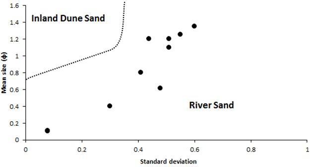 Figure 7 are plots based on granulometric parameters that discriminates between river channel deposits, overbank deposits and overbank-pool deposits; majority of the Lokoja sandstones plotted in the river channel zone. According to Mycielska-Dowgiałło and Ludwikowska-Kędzia [70] the overlapping of two fields (river channel deposits and overbank deposit) in Figure 9C corresponds to the best sorted grain-size which is approximately 2 Ф (0.25 mm). The boundary between the two facies in figure 9B is, similarly, situated in the zone of the best sorting and the zero value of skewness [70].