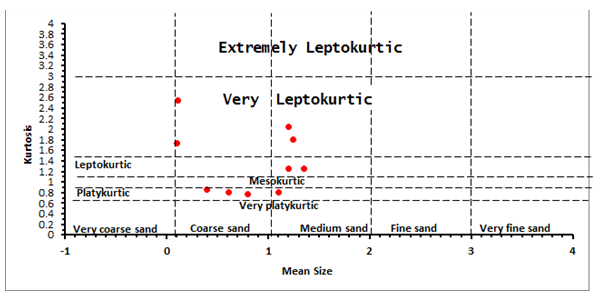 Figure-9. Bivariate plot between mean grain size and Kurtosis, fields based on Blott and Kenneth [72]. (This study).