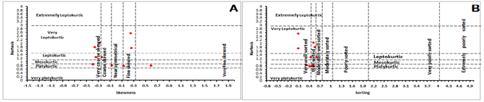If Y1 is less than -2.7411, Aeolian deposition is indicated and if greater than -2.7411, the environment is beach. All the samples have Y1 values that are greater than -2.7411 (Table 2), which imply beach environment.Figure-10. Bivariate plots: (A) Skewness vs. Kurtosis; (B) Sorting vs. Kurtosis, fields based on Blott and Kenneth [72]. (This study).