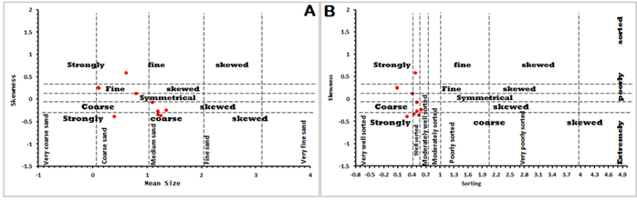 Figure-11. Bivariate plots: (A) Mean size vs. Skewness; (B) Sorting vs. Skewness, fields based on Blott and Kenneth [72]. (This study).