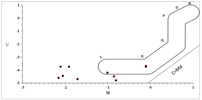 The CM pattern or the Passega diagram can be used to determine the environmental conditions in which sediment was deposited based on the parameter C (one percentile of the grain size distribution) and M (the Median: 50th percentile of the grain size distribution) that are valuable in hydrodynamic interpretation of grain size data. The Passega diagram in Figure13 features several fields, pelagic suspension (T field), uniform suspension (SR field), gradual suspension (QR field), suspension and rolling (QP field), rolling and suspension-PO, rolling (ON field) corresponding to the various transports and sedimentation conditions in the marine, littoral or fluvial domains. From the Passega diagram only three samples plotted within the parameter zone around the uniform suspension-SR zone; SR (uniform suspension) segment indicates the role of uniform suspension in transporting segments. Most of the samples plotted outside the featured fields.Figure-13. Passega diagram of the Lokoja sandstones, after Passega, 1957.