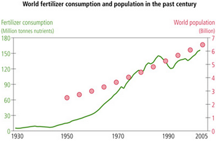 Figure-1. World Fertilizer consumption and population between 1930 and 2005