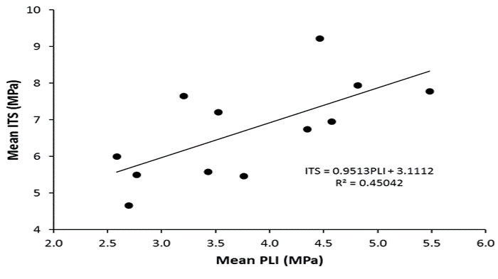 The mean values of PLI for 50 mm in diameter size samples were plotted against the mean values of ITS for each test (Fig. 3). This figure also shows a weak correlation between the mean PLI values for the 50 mm in diameter size samples and the mean ITS values. This may be due to sample heterogeneity.