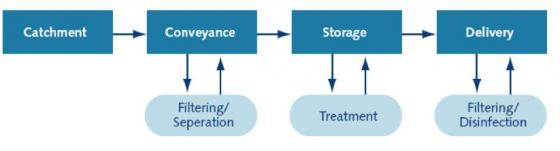 According to Hatum and Worm [15] rainwater harvesting system consists of at least the following components; rainfall, roof surface to collect rainwater, delivery systems (gutters) to transport the water from the roof or collection surface to the storage reservoir and storage reservoirs or tanks to store the water. This is shown in Figures 1 and 2.