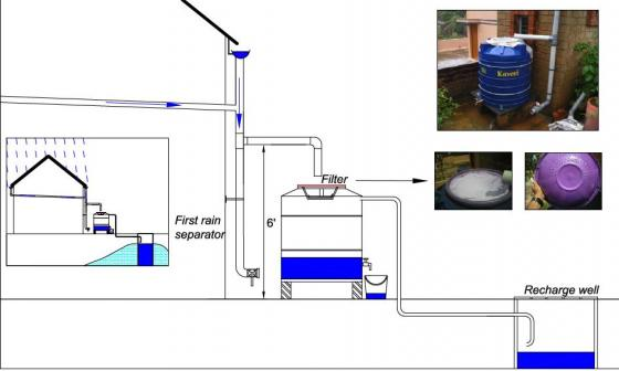 Figure-2. Illustration of water flow scheme of a RTRWH system. Basic components: roof, gutters, first flush device (first rain separator), rain barrel with filter and tap and recharge well.