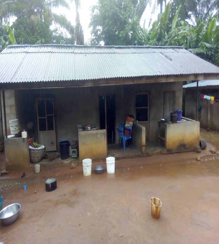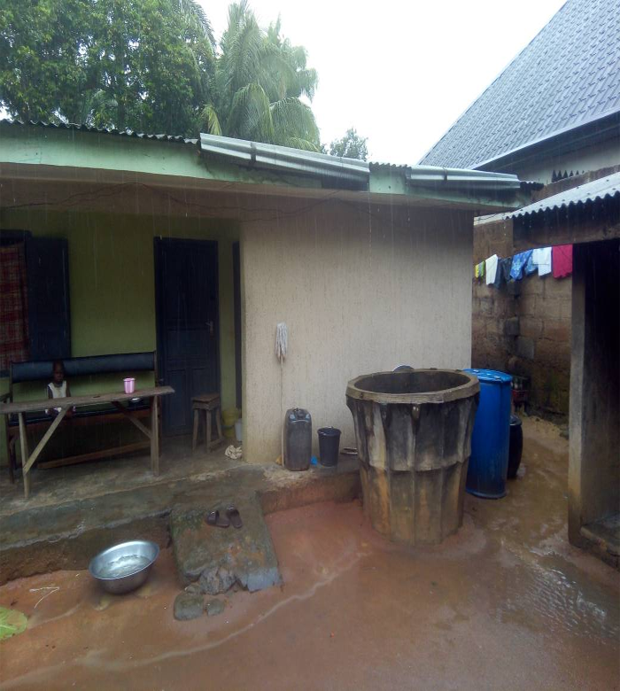 The study identified that most of the rural population in Orsumoghu community live in cement built residential houses with rooftops made from zinc, aluminum and concrete materials See Figures 5, 6, 7& 8. It was also noted that cement was the preferred material for the construction of other buildings such as schools, churches and health centers. Information from key informants confirmed that the adoption of RWHS is as old as the existence of the community and has become enshrined in their lifestyle. The men also confirmed that in their community it is their responsibility to channel the rain water flow at the rooftops and position the water storage vessels while the women collect and store harvested water in larger vessels. The women leader also confirmed that harvested rain water collection and storage is a culture that was handed over from generations before them. She also said that it was the duty of women to use buckets during rainfalls to collect water which is used for various uses such as drinking, cooking, bathing, dish and clothe washing and gardening. The informants highlighted their dependence on rain water since costs from water vendors are expensive and cannot meet the large demands that would satisfy their daily domestic needs. This cost about 3,000 naira (8.28 USD) during wet season and 5,000 naira (13.80 USD) during dry season. Based on observations and as seen in Figures 5, 6, 7 & 8 the rainwater harvesting designs in the community were poorly built. This happened to be a general practice as most houses had similar unsanitary arrangements. Majority of the rooftops had no construction used on them which is supposed to provide a strong support to gutters (perpendicular to the edge of the building) that drain water away from the roofs. Generally, the runoff from the rooftops were not properly guided as the linings of the roof materials drain water directly or through folded sheets of zinc material into open buckets, jerry cans, large water vessels placed at strategic positions of high rain water runoff.