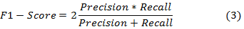 The harmonic mean of Recall and Precision is called F-1 score, the range of F1-Score is between 0 and 1. 1 represents the absolute best model and 0 represents the worst model [14]. In some cases precision is important, in others TPR is crucial so when we need to overall understand the accuracy of model F1-Score is one of the best measurements for classification models. It is represented by Equation 3 that shows that F1 score is calculated based on precision and recall. It is twice the product of precision recall divided by sum of precision and recall as shown in Equation 3