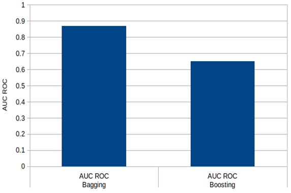 Another way of looking at the model for the purpose of understanding is ROC AUC i.e Area under the curve of ROC which is given in Figure 4. It can be seen from the bar graph that the bagging algorithm is posing a higher value of ROC than boosting algorithm. Thus RUC proves that bagging algorithm is better than boosting algorithm.