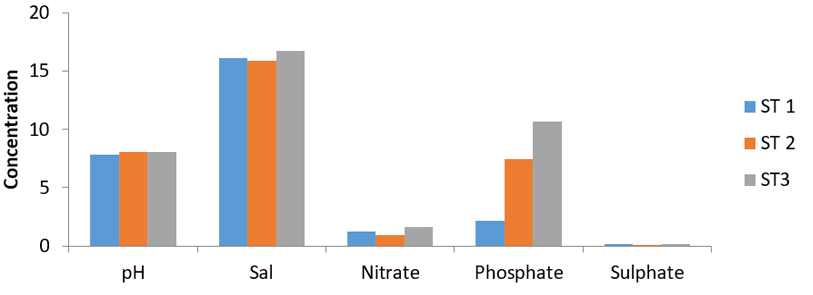 The results of the analysis of the water samples of the river nun estuary are presented in Tables 1 and 2 and Figure 2. The mean values of the physico-chemistry ranged from 7.867 to 8.033, 15.84mg/l to 16.7mg/l, 0.923mg/l to 1.62mg/l, 2.197mg/l to 10.68mg/l, and 0.103mg/l to 0.179mg/l for pH, Salinity, Nitrate, Phosphate, and Sulphate, respectively.  The highest mean value of pH (8.033) was recorded in sampling station 3 while the lowest value (7.867) was recorded in sampling station 1. Salinity was highest in sampling station 3 (16.7mg/l) and least in sampling station 1 (16.097mg/l). Nitrate were high in sampling station 3 (1.62mg/l) than stations 1 and 2 which had 1.217mg/l and 0.923mg/l respectively. Also, Phosphate were higher in sampling station 3 (10.68mg/l) than stations 1 and 2 which had 2.197mg/l and 7.47mg/l, respectively. Furthermore, the mean Sulphate value of sampling station 3 (0.179mg/l) was higher than those of stations 1 and 2 which had 0.139mg/l and 0.103mg/l, respectively.