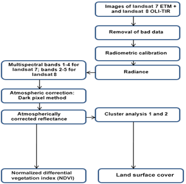 NDVI was retrieved from the atmospherically corrected Red (R) and Near Infra-Red (NIR) reflectance (Figure 2). The quantification of photosynthetic activity is carried out using Normalized Differential Vegetation Index (NDVI) algorithm. NDVI is vigorously corresponding to vegetation density and liveliness [2, 26]. NDVI is established on a high reflectance in the NIR by plant matter in contrast to the strong absorption by chlorophyll‐a in the Red wavelengths. For Landsat 7, band 3 is Red and band 4 is NIR. For Landsat 8, band 4 is Red and band 5 is NIR.