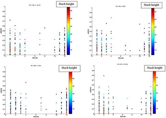 Multiple linear regression was applied to the relationships between each of the (NDVI450-60)mN, (NDVI450-60)mE, (NDVI450-60)mS and (NDVI450-60)mW and the facility size, stack height, and time). Table 6 shows the results (r2 and p-values).