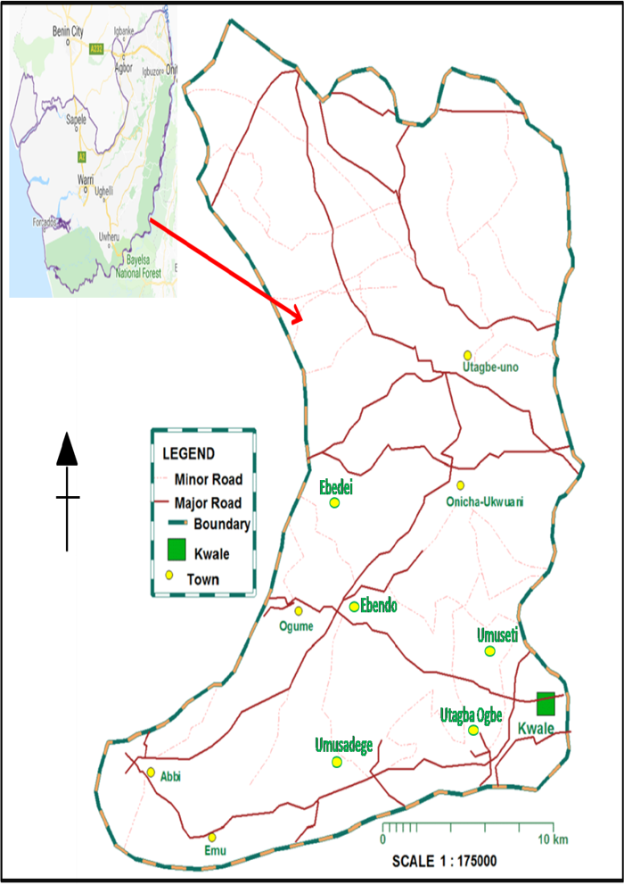 This study was carried out in Kwale, a community with sub-communities located in Ndokwa West Local Government Area of Delta State. It lies between latitude 6o111 – 52o231 N and longitude 6o431 – 42o51481E see Figure 1. Kwale is inhabited by three major native groups with the predominant being the Ukwuani, Aboh Ndoni speaking native; followed by the Urhobo-Isoko ethnic group (the second most dominated natives) and the Ijaws (Ukala, 2011). There are other non natives residing within the communities. Utagba ogbe is the main initial downtown area of the community. The community has an estimated population of over 176,060 people (National Bureau of Statistics, 2006) who are predominantly traders, artisans, fishermen, farmers, businessmen and civil servants. The community is a host to oil and gas companies, some of which have presence in different parts of the African cities. Some of the activities of the oil companies are situated in Ebedei nearby Umukwata, Ebendo, Umuseti and Umusadege with pipeline running from Aboh and river Ase creeks.