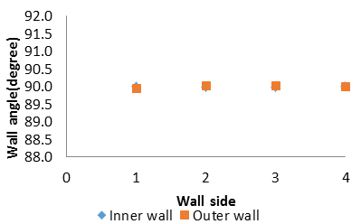 Figure 6 shows the result of the trials when the sample was not machined nor was its base plate removed. This is the deposited sample on the base plate (see Figure 3) and this is the level of perpendicularity of the deposited wall prior to removing the base plate and prior to machining. It can be seen from Figure 6 that the deposited walls were not actually perpendicular to the base plate, but the graph shows the actual perpendicularity of each of the four walls deposited which can be compared to when the base plate is removed or the surface of the wall machined.