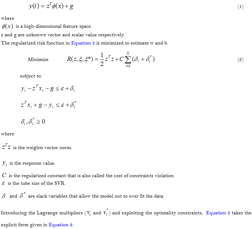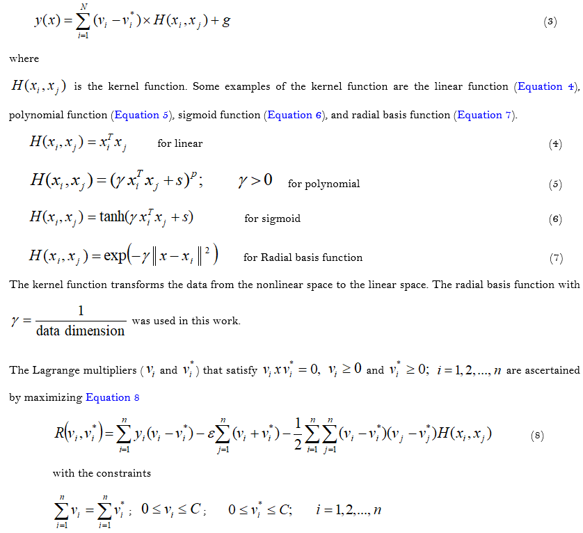 The SVR proposed by Vapnik (1982) uses a nonlinear mapping to approximate a function that performs a regression in a feature space after mapping the input data into a high-dimensional feature space. The form of the function that SVR approximate is given in Equation 1.