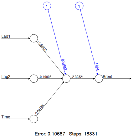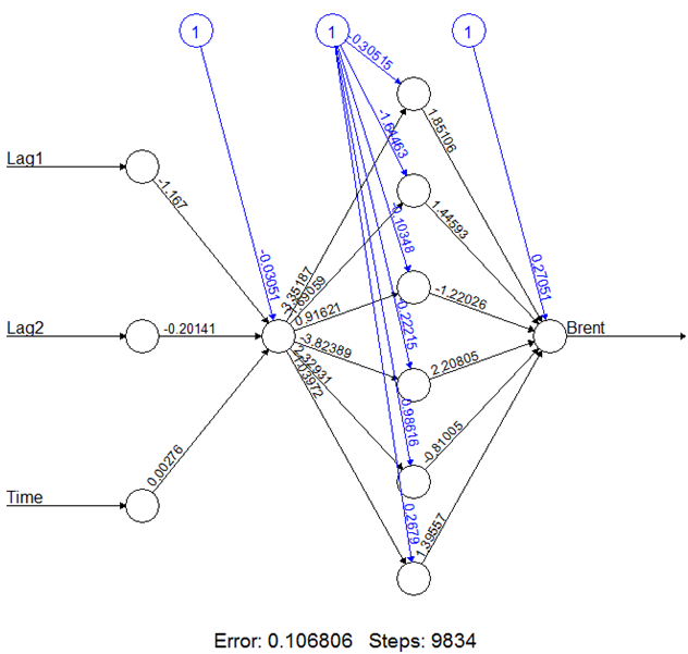 In obtaining the optimal model for the ANN, different node sizes for the hidden layer ranging from 1 – 8 were used to fit the model. The performance of the ANN models with different hidden node size is given in Table 1. The model with only 1 node in the hidden layer has the best between the MAPE, RMSE and NSE in both sets; and is considered the optimal ANN model for the Brent crude oil prices. Increasing the nodes in the hidden layer either resulted to overfitting or poor fitting of the training set of the Brent crude oil prices. Minimizing the quadratic error function gave us the weights of the model. The weights and the plot of the neural network are shown in Figure 5.