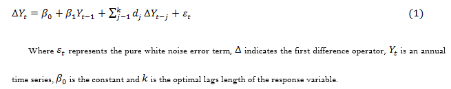 In this study, we applied the Augmented Dickey–Fuller (ADF) and Phillip–Perron (PP) unit root tests to examine the stationary stance for the long-run relationship of time series variables.