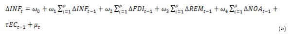 Since the valid evidence that the long-run relationship between foreign direct investments, remittance inflows, net official development assistance received and inflation has been established, we then move ahead and applied the ARDL method of estimation to determine the long-run and short-run coefficients. The short run and long run models for estimating the coefficients are stated in Equation 4 and 5.