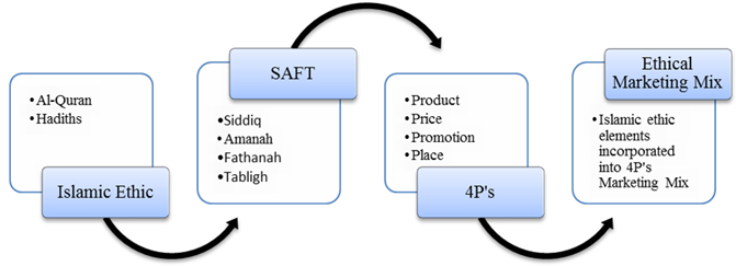 Several works on Islamic marketing particularly mentioning ethics in marketing mix from an Islamic perspective have made these characteristics as compulsory in their literature review (Hassan et al., 2008; Arham, 2010) to name a few. However, no multidimensional study which investigated the SAFT i.e. the Four commendable characteristics of Prophet Muhammad (PBUH)) that correlate with marketing mix approach had ever been reported. According to Saeed et al. (2001) it is not surprising to learn, therefore, that marketing ethics merit special attention in Islam and constitute a separate discipline underpinned by documented practices of the Prophet (pbh). Nooh (2015) concluded, ethics and moral from Islamic perspective is akhlaq or the state of feelings that shapes human behavior. Thus, to shape the akhlaq of one self, he or she have to practice the characteristic of the prophet such as Siddiq, Amanah, Fathanah, and Tabligh.
