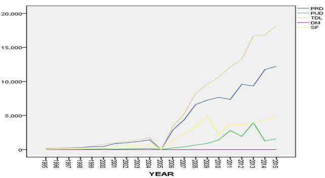A look at Table 2 clearly shows an upward trend among the categories of deposit liabilities and the shareholders’ funds particularly from 2006 following successful mergers and acquisitions completed in 2005. Figure 1 above graphical confirms this trend. However, PUD(green) exhibits a nose-dive in 2014 most likely because of governments campaign/election- related spending for the 2015 general elections in Nigeria while 2015 is affected by Treasury Single Account Policy took off from 2015.