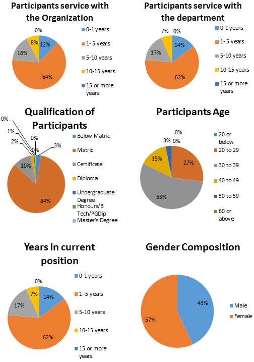 The collected data was presented as per the pie charts in Figure 2 below. These were related to the participants’ service with the organisation, participants’ service with the department, years in current positions, qualifications of participants, gender composition, participants’ age and race composition.