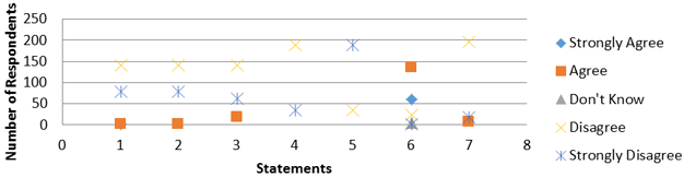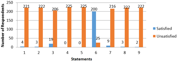 Based on the statements presented to the participants and their responses, it was evident that the majority of the participants (88.14%) indicated that they were not satisfied with their current conditions or jobs. The correlation inherent to job satisfaction for each statement was based on the responses for each statement whereby some responses presented a positive scenario and others a negative scenario which would indicate an agreement or disagreement of the respondents towards the statements given. It was noted that majority of the respondents disagreed with the majority of the statements given which meant that the level of their job satisfaction was low.
