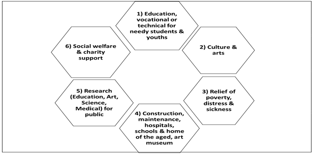 The chain of social impact started from providing education for nurturing students with knowledge and techniques; nurturing students to be cultural; helping the community to relieve the weak communities with the use of knowledge in short-term, then building facilities for continuing the aids in medium-term, and finally funding research for improving the society on long-term basis. For maximizing the social benefits, such charitable settings needed to be reinforced by the foundation management, then to be recognized in the community and hence to gain social support.