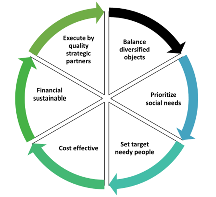 Health, education, promotion of strategic philanthropy, human services and social development in Hong Kong are areas to be provided balanced and diversified beneficiaries. Coverage of donation should be spread among various social groupings in needs. Prioritization of social needs depends on the needy situation of the society in respective years of project application. This may change with reference to the Government social welfare policies. The target is set to people in need, cost effectiveness and financial sustainability relate to the adoption of social return on investment (SPOI) for project evaluation. Other financial decision-making concerns are also required to be considered in the framework. Execution by quality strategic partners is monitored in annual charity funding approval in charity donation. Annual review and funding re-approval are scheduled for continuality and sustainability. Finally, improving cause of social issues is the long-term goal of the charity endeavor. Continued improvement is always the underlying mechanism.