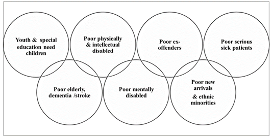 Good utilization of scarce financial resources, balanced and diversified funding to beneficiaries, equitable funding of project in need, execution by quality strategic partners, and of course cost effectiveness and financial sustainability were the major concerns. Following the above plan principles, Elson Law disclosed the following areas for supporting people in need in seven groups as shown in Figure 3.