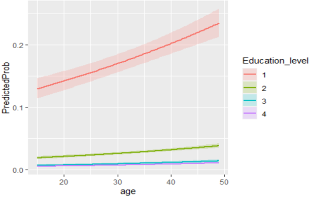 Further, graphs of predicted probabilities are used to understand and/or present the model. Therefore, the plot with the predicted probabilities is presented in Figure 2. Recall that 1 represents Higher Education, 2 represents Secondary Education, 3 represents Primary Education and 4 represents No Formal Education in the levels of education as displayed. The plot in Figure 2 shows that the model predicted probabilities for insurance cover increases significantly with age for only those that are with higher education, followed by those with secondary school education while it remained almost the same for those with primary education or no formal education at all.