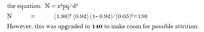 d = allowable error (it is the difference between the true population rate and the sample rate one wishes to tolerate), which is 5 percent within 95% confident limit.