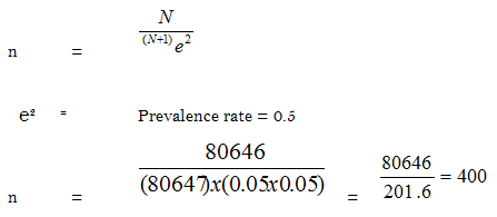 The study employed both the quantitative and qualitative methods to a mixed-method approach to examine and explore patterns and correlates of knowledge of health risk associated with alcohol consumption among undergraduates of government-owned higher institutions of learning in in Kwara State, Northcentral Nigeria. This study adopted the cross-sectional survey method, and elicited information form 400 undergraduates from three purposively selected public tertiary institutions. The snowball research technique was also adopted. The study quantitative data were collected through the administering of a well-designed questionnaire to legible respondents. The qualitative data was sourced through the conduction of in-depth interviews (IDIs) among legible respondents in the studied locations. Three (3) IDIs were conducted each among undergraduates in Federal Polytechnic, Offa and Kwara State College of Education, Oro while four (4) IDIs were conducted in University of Ilorin Thus, a total of ten (10) IDIs were conducted across the studied higher institutions of learning. The selected sample size in each of the studied higher institutions of learning is based on the total number of students in each of these institutions. Using the Slovin’s formula, n = N/ (N+1) ℮2. Total number of students was obtained from personnel office in the studied institution.