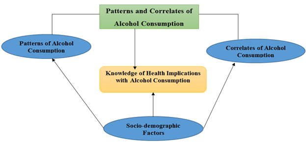 Figure-1. Conceptual model showing patterns of alcohol consumption and linking students’ knowledge of health implications to correlates of alcohol consumption.