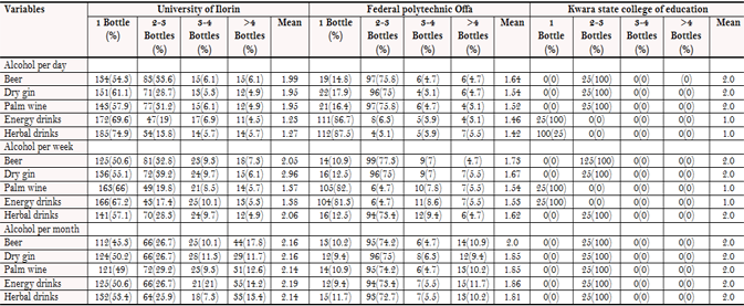 Findings from the study on frequency of alcohol consumption showed that various types of alcoholic drinks were consumed by the respondents at varying rates. It is evident from the study that more than half of the respondents in University of Ilorin consumed at least a bottle of beer (50.6%), dry gin (55.1%), palm wine (66%), energy drinks (67.2%) and herbal drinks (57.1%) on weekly basis. The outcomes of the study also showed that that about three-quarters of the respondents from Federal Polytechnic, Offa consumed between 2 to 3 bottles of beer (74.2%), dry gin (75%), palm wine (74.2%), energy drinks (73.4%) and herbal drinks (72.7%) every months, while a quarter of the students from Kwara State of Education, Oro consumed between 2 to 3 bottles of dry gin (25%) and palm wine (25%) on weekly basis. Therefore, it is evident from the study that the frequency of alcohol consumption among respondents across the three public tertiary institutions was relatively high. Therefore, the findings from this study showed that the prevalence of consumption of alcohol among the students of the selected public tertiary institutions in Kwara State was high.