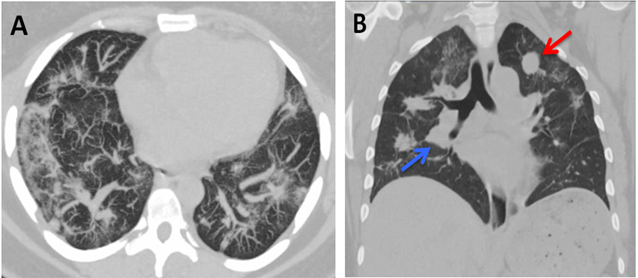 Figure-1. CT of the chest without contrast. A) Diffuse patchy opacities in both lungs. B) Well-circumscribed masslike soft tissue nodule in the left lung apex (red arrow) and a masslike opacity in the right perihilar region (blue arrow).