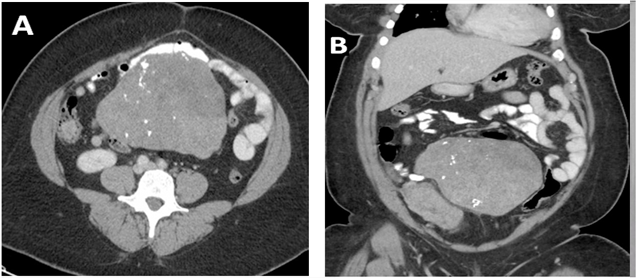 Figure-2. CT of the abdomen and pelvis with contrast. A) Multiple large uterine and exophytic uterine masses with calcifications. B) The largest mass creates a mass effect in the abdomen on the bowel.