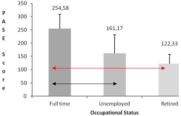 The current sample has a mean PASE score of 168.0±87.46. Male caregivers had 141.6±66.85 and female 180.5±93.9. No differences were found between male and female. The majority of caregivers (69.8%) had a high (206.41±75.40) PASE score (> 122). The PASE score was analyzed by age and sex of caregivers, level of education, years of care, hours of care/day, type and stage of dementia and no differences were observed. Figure 1 and Figure 2 show the differences in PASE score between different occupational status (F=6.210, p=0.001) and living arrangements (F=3.882, p=0.05). No differences were found in PASE score between different levels of burden (F=1.058, p=0.376). The PASE score was not related to GHQ28 scores.