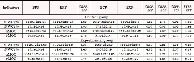 Levels aPWC170, rPWC170, aMOC, and rMOC matched low value. In general, the pre-test results determined the insufficient level of physical fitness of the surveyed groups (Table 3.1). The conclusive evidence of the above results was the data relative changes in the study of physical performance and aerobic productivity for basketball players in the control and experimental groups. In the testing of the functional state of the body on the subject to maintain the overall physical performance, it can be stated that for the period of rest not the adaptive stereotypes embodied for the past seasons have been lost. Therefore, with an average energy at the beginning of the season, the leading role of aerobic mechanisms in central and vice versa could be saved, to ensure the efficiency of the anaerobic organism in point guards laid down as a result of the coaching process, as well as according to their physiological characteristics. As a matter of fact, the implementation of the coaching program leads to a significant increase in performance and efficiency of power supply arrangements for the players. It should be noted for preservation of specific stereotype for all players' positions in basketball. Further, to summarize the last phase of the survey, the attention should be paid about the rising level of fatigue and the partial depletion of energy systems. It should be emphasized that this decline is not dramatic and disastrous nature of all the indicators of power supply is not reduced to a level that allows speak of exhaustion and inability to maintain physical condition of basketball players.