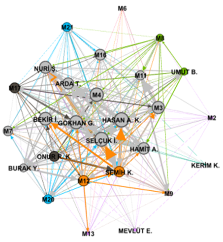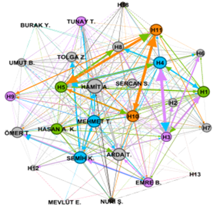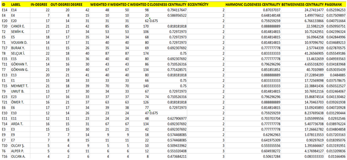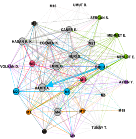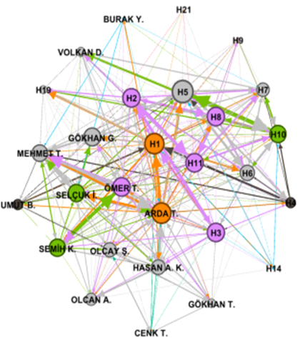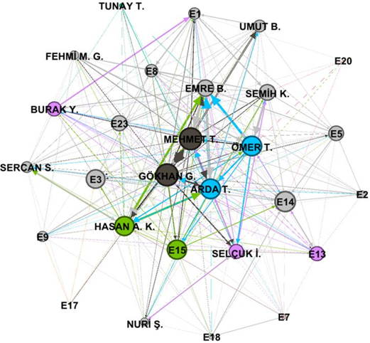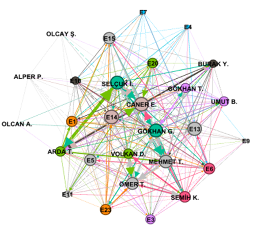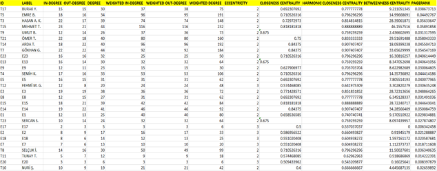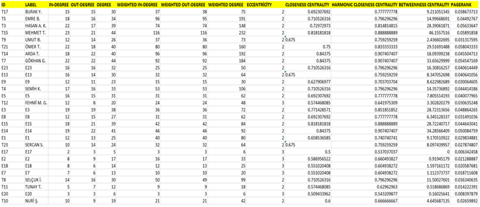 In the preparation of the data, firstly the Excel pass files obtained from the images of each game were processed in the open-source Gephi program and the networks of the matches and the measurements of these networks were obtained. We like to share the network drawing from the Turkey-Estonia World Cup 2014 qualifying match, played on 09/11/2012 and resulting 3-0 Turkey's victory, see Figure 4 and the resulting network measurements see Figure 5.