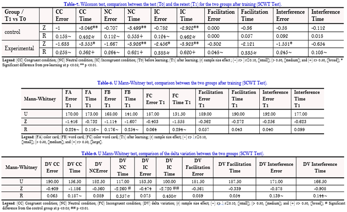 Table-2. Wilcoxon test, comparison between the test (T0) and the retest (T1) for the two groups after learning (RTD Test).