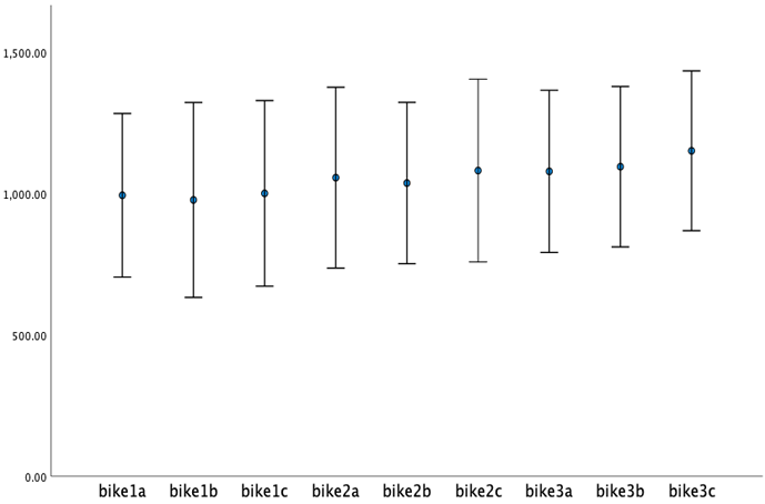 Using a repeated measures analysis, lower body power prior to engaging in nutritional supplementation with an enzyme hydrolyzed multiple ingredient product was compared to lower body power after 10- and 21-days of supplementation. Lower body power was significantly higher after the two supplementation periods at varying trials. Trial bike1a compared to trial bike3c the mean difference between trials was -157.375, which displayed a significant difference (p=0.007). Trial bike1a compared to trial bike3a had differing mean scores of -84.62, which was significant (p=0.035), trial bike1c to trial bike3c had a mean difference of -150.62, which was significant (p=0.008). Figure 2 shows the mean scores of each trial for the lower body power assessment portion of this research project.