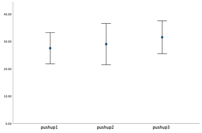 Using a repeated measures analysis, upper body muscular endurance prior to engaging in nutritional supplementation with an enzyme hydrolysed multiple ingredient product was compared to lower body power after 10 and 21 days of supplementation. A significant difference in scores between trial pushup1 and trial pushup3 was observed (-4.00, p=0.043). No other significant differences in mean scores were observed. Figure 5 shows the mean score values of each trial assessing upper body muscular endurance.