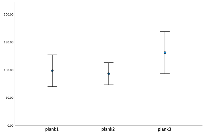 Using a repeated measures analysis, midline muscular endurance prior to engaging in nutritional supplementation with an enzyme hydrolysed multiple ingredient product was compared to lower body power after 10 and 21 days of supplementation. A significant difference between mean scores comparing plank2 and plank3 was observed (-38.00, p=0.043). No other significant differences were observed between trials assessing midline muscular endurance. Figure 6 shows the mean score values of each trial assessing midline muscular endurance.
