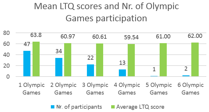 Considering their learned leadership skills of the elite athlete, the number of Olympic games they have competed could represent another variable that might potentially influence the mean LTQ score. Analyzing the scores, most surveyed athletes (n=45) participated in one Summer Olympic Game and obtained an average LTQ score of 63.8, while the unmatched achievement in competing in six Summer Games achieved by 2 athletes obtained a mean LTQ score of 62. The results of the survey show that number of Olympic games participation does not produce a statistically significant difference between the LTQ scores of athletes who participated in one or more games. The data obtained from crosstabulation between LTQ scores and number of Olympic Games participation can be seen in Figure 2.