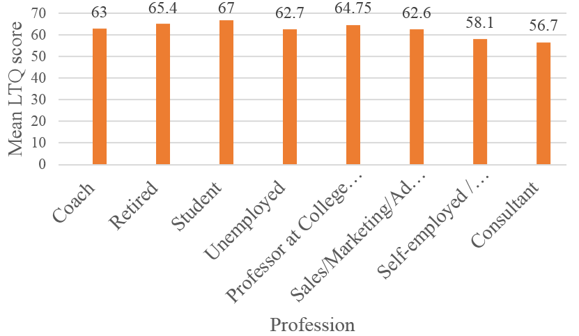 The career choices made by Olympians after completing their sporting careers varied but most Olympians surveyed relied upon their sport-specific knowledge gained through years of training and competition and became coaches (n=46). There were also others who remained in the sporting world, taking up careers such as a consultant (n=7), a college professor (n=4), teachers (n=4), or physical therapists (n=1). Other elite athletes in our survey have ventured into other fields such as law, technical support, engineering, and accounting, while others have already retired (n=5). The researcher examined if there was any correlation between the choice of career and the average LTQ of elite athletes. According to data collected, there is no significant correlation between an individual's LTQ score and their career choices, as shown in Figure 4.