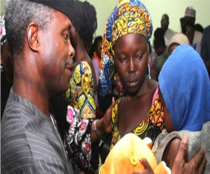Visual H: Vice-President of Nigeria, Yemi Osinbajo (left), receiving one of the released Chibok School girls in Abuja on October 13, 2016.