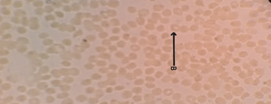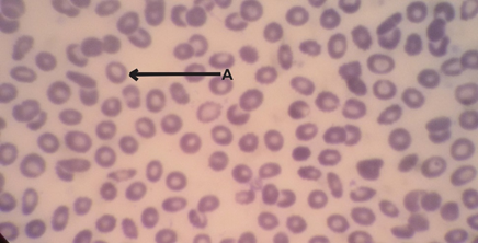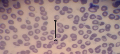 Figure-4. Thin blood film stained with Leishman Stain showing arrow on stained red cell (A)