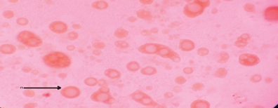 Fig-1. Unstained thin blood film showing arrow on unstained red blood cell (B)